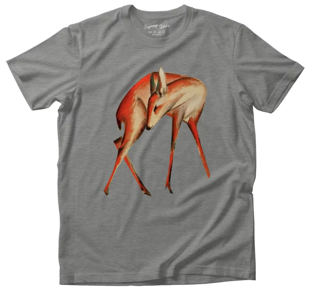 - Koszulka Sarna Franz Marc w wersji szara. Stylowa koszulka z nadrukiem dzieła sztuki, łączy wygodę i artystyczny charakter. Idealna propozycja dla miłośników sztuki.