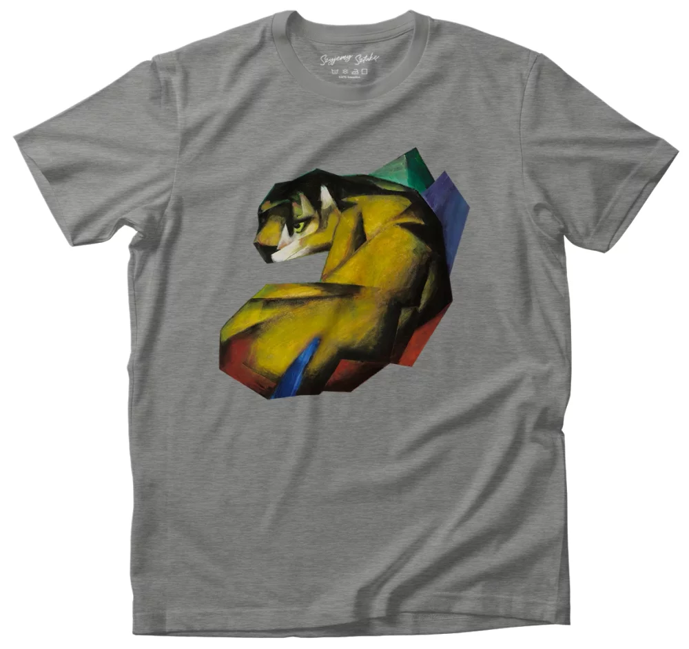 - Koszulka Tygrys Franz Marc w wersji szara. Stylowa koszulka z nadrukiem dzieła sztuki, łączy wygodę i artystyczny charakter. Idealna propozycja dla miłośników sztuki.