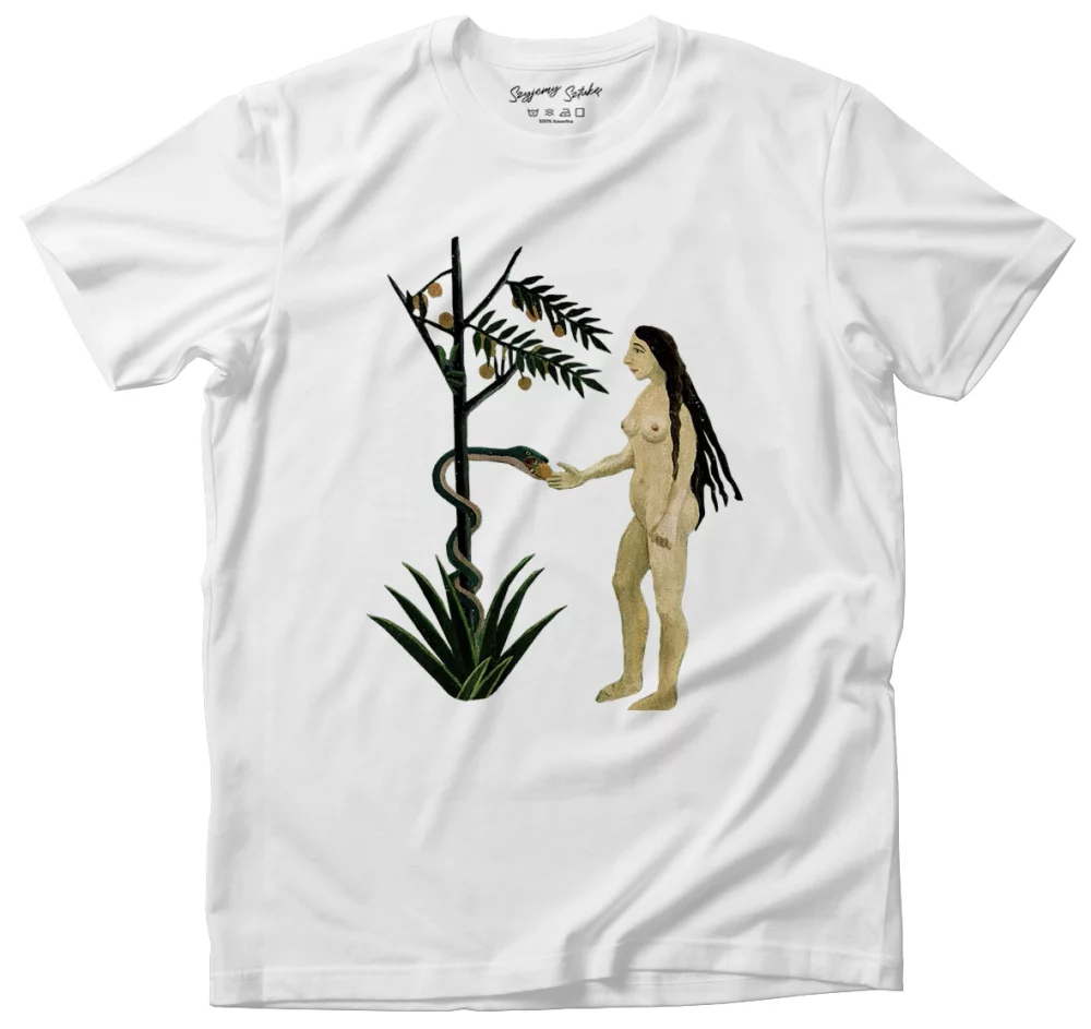 - Koszulka Eve Henri Rousseau w wersji biała. Stylowa koszulka z nadrukiem dzieła sztuki, łączy wygodę i artystyczny charakter. Idealna propozycja dla miłośników sztuki.