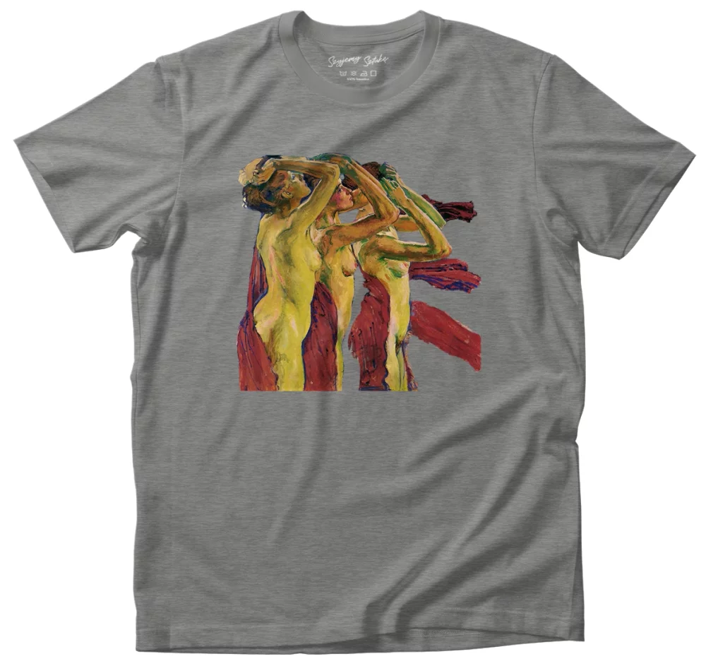 - Koszulka Trzy akty Koloman Moser w wersji szara. Stylowa koszulka z nadrukiem dzieła sztuki, łączy wygodę i artystyczny charakter. Idealna propozycja dla miłośników sztuki.
