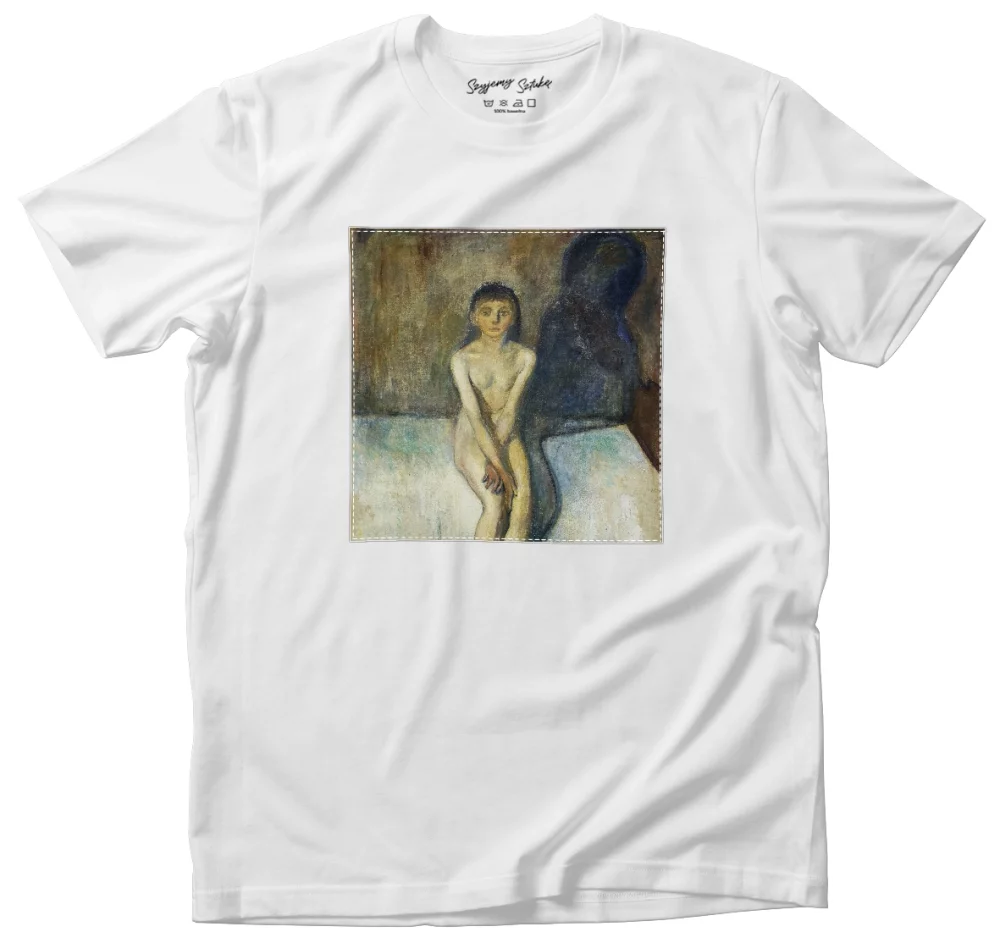 - Koszulka z naszywką Puberty (Dojrzewanie) Edvard Munch Wysoka gramatura, trwałość i unikalny detal nadający charakteru. Każda sztuka szyta na zamówienie – wyjątkowa, solidna i stylowa!