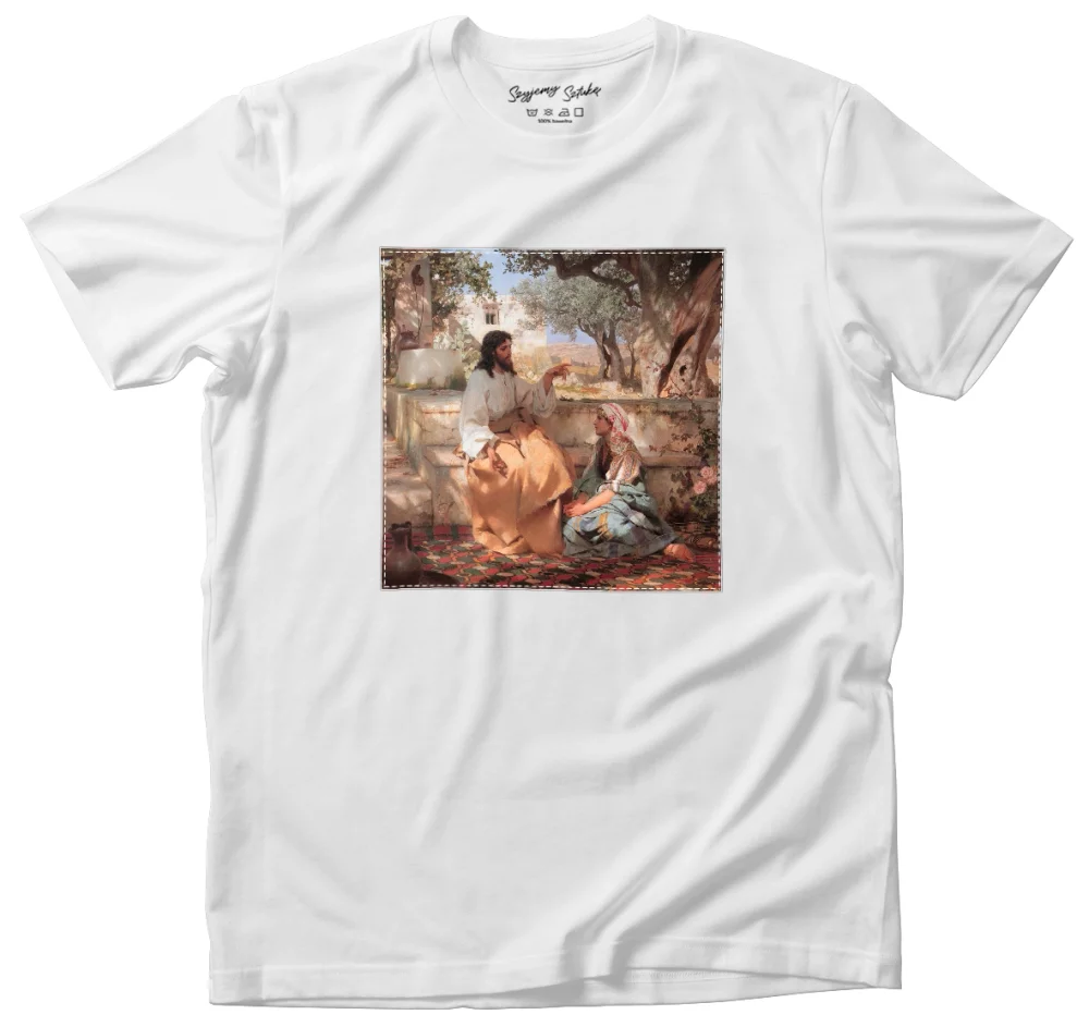 - Koszulka z naszywką Chrystus w domu Marii i Marty Henryk Siemiradzki Wysoka gramatura, trwałość i unikalny detal nadający charakteru. Każda sztuka szyta na zamówienie – wyjątkowa, solidna i stylowa!