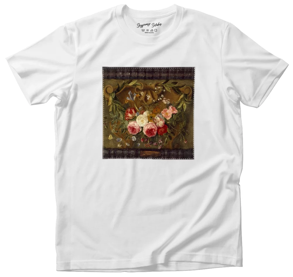 - Koszulka z naszywką Dekoracyjna martwa natura Z girlandą kwiatów Jan van Kessel (starszy) Wysoka gramatura, trwałość i unikalny detal nadający charakteru. Każda sztuka szyta na zamówienie – wyjątkowa, solidna i stylowa!