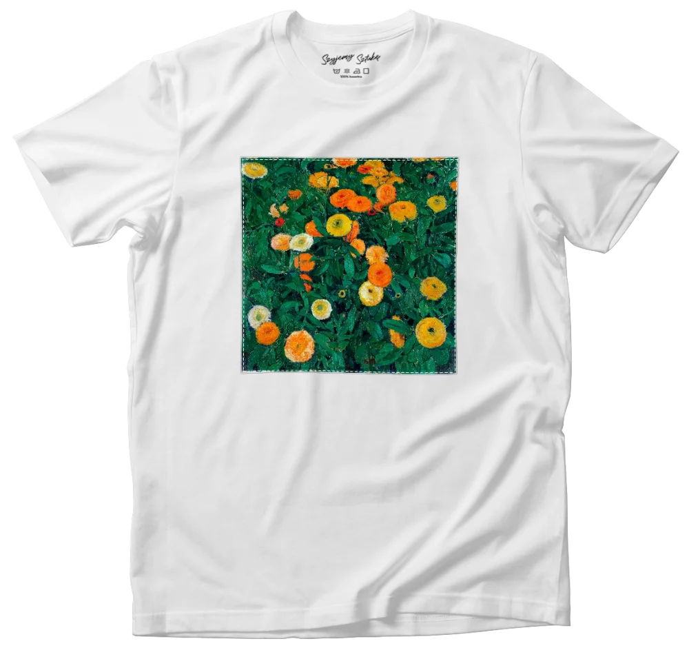 - Koszulka z naszywką Marigolds Koloman Moser Wysoka gramatura, trwałość i unikalny detal nadający charakteru. Każda sztuka szyta na zamówienie – wyjątkowa, solidna i stylowa!