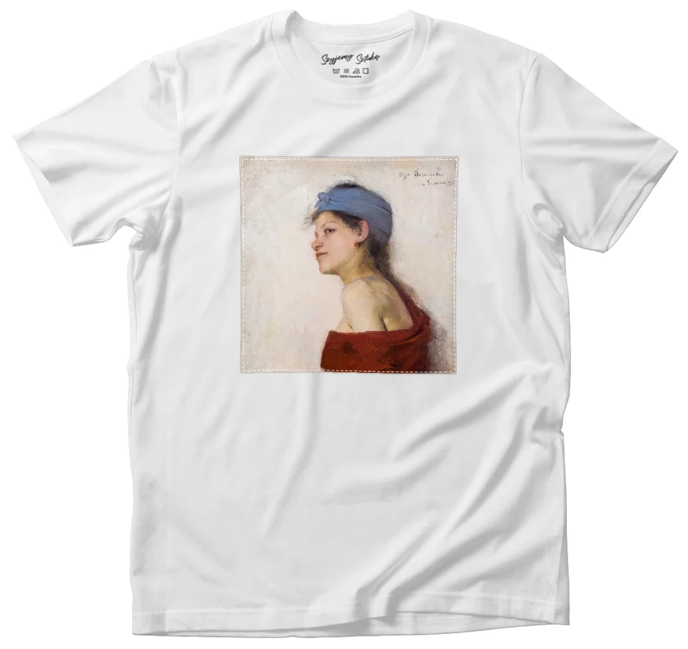 - Koszulka z naszywką Portret kobiety - Cyganka Olga Boznańska Wysoka gramatura, trwałość i unikalny detal nadający charakteru. Każda sztuka szyta na zamówienie – wyjątkowa, solidna i stylowa!