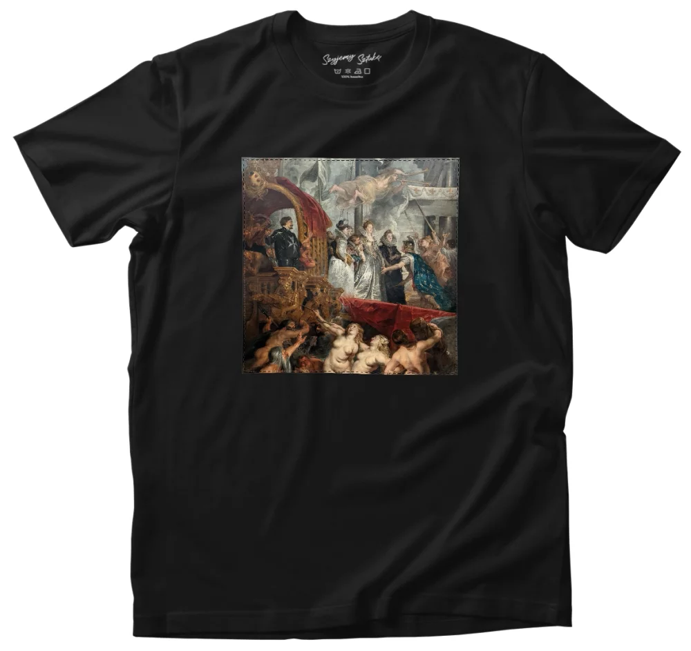 - Koszulka z naszywką Przybycie Marii Medycejskiej do Marsylii Peter Paul Rubens Wysoka gramatura, trwałość i unikalny detal nadający charakteru. Każda sztuka szyta na zamówienie – wyjątkowa, solidna i stylowa!