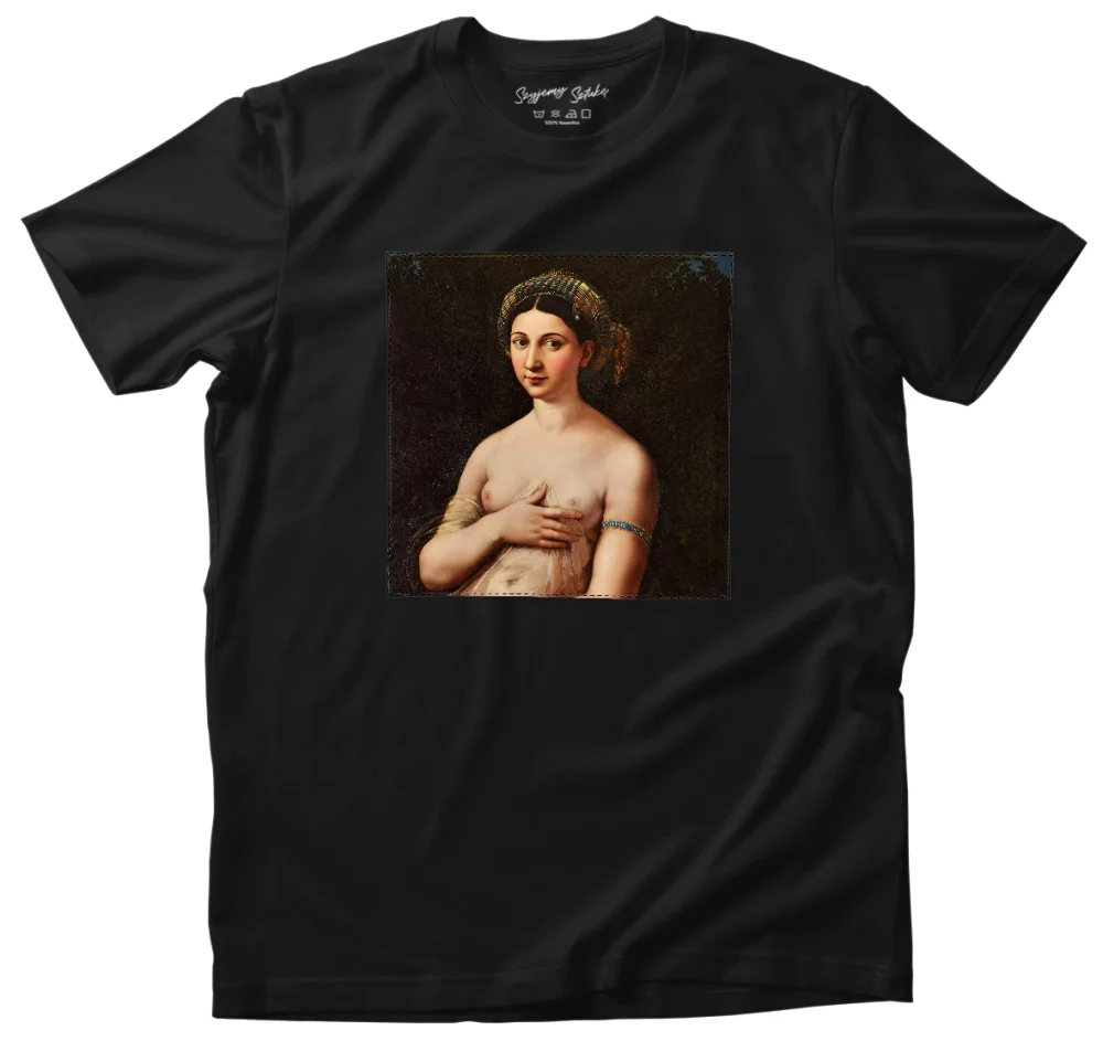 - Koszulka z naszywką La Fornarina Rafael Santi Wysoka gramatura, trwałość i unikalny detal nadający charakteru. Każda sztuka szyta na zamówienie – wyjątkowa, solidna i stylowa!