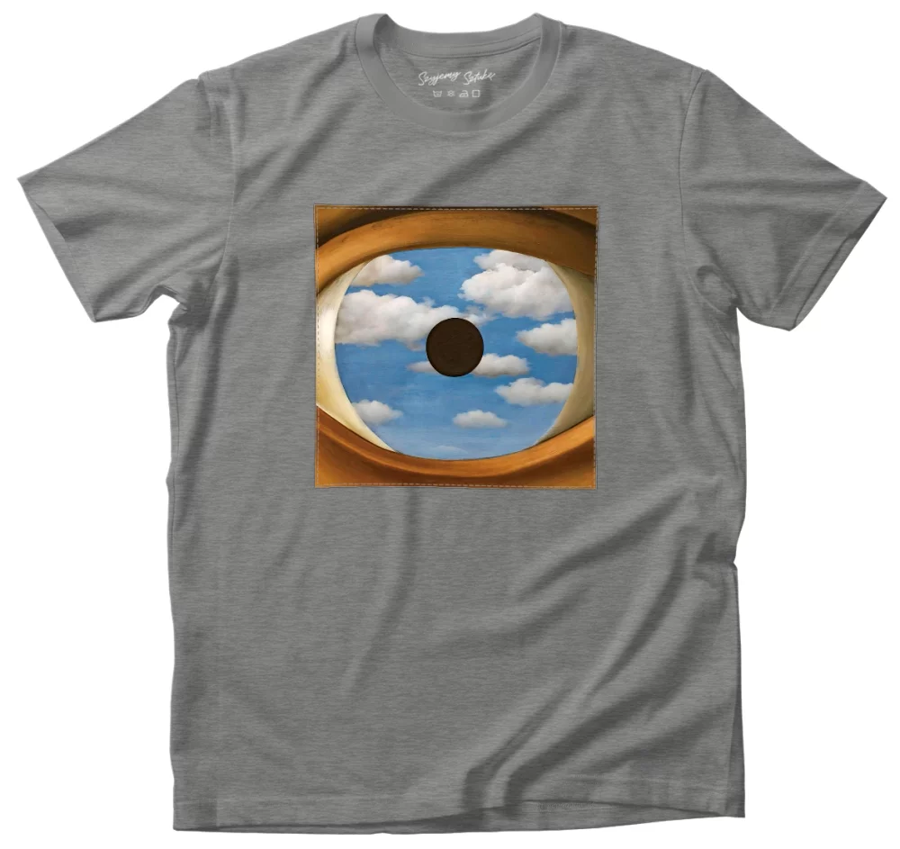 - Koszulka z naszywką Fałszywe lustro René Magritte Wysoka gramatura, trwałość i unikalny detal nadający charakteru. Każda sztuka szyta na zamówienie – wyjątkowa, solidna i stylowa!