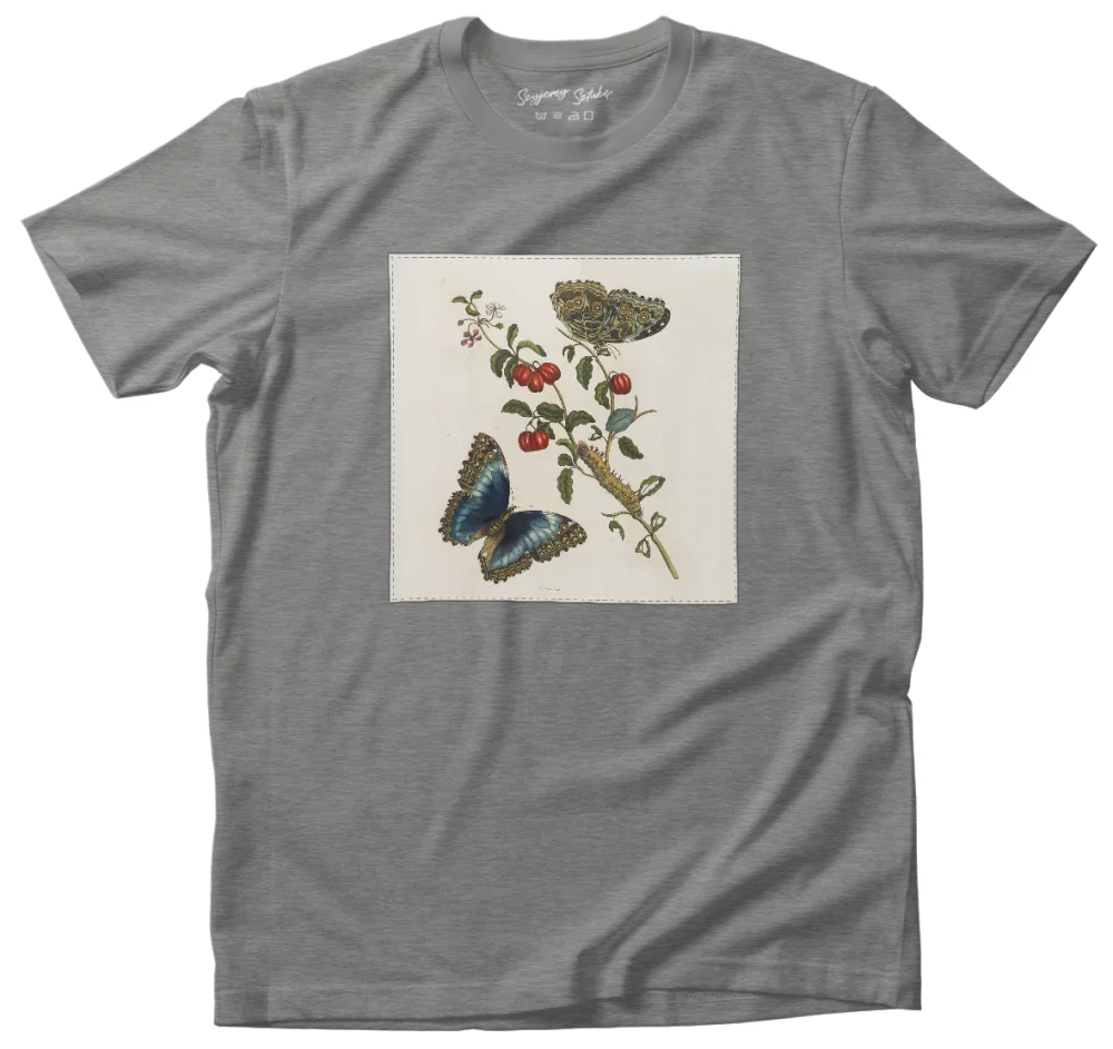 - Koszulka z naszywką Great Blue Butterflies and Red Fruits Maria Sibylla Merian Wysoka gramatura, trwałość i unikalny detal nadający charakteru. Każda sztuka szyta na zamówienie – wyjątkowa, solidna i stylowa!