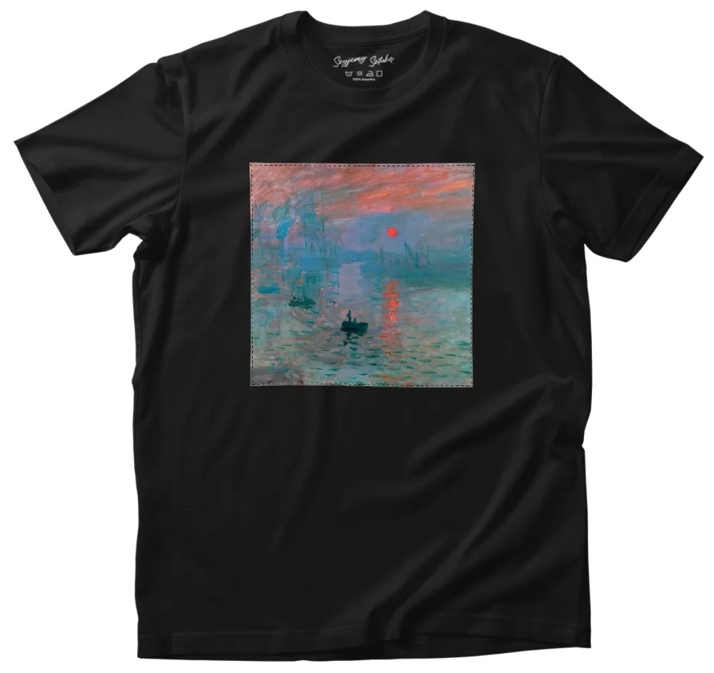 • Koszulka z naszywką Impresja, wschód słońca Claude Monet Wysoka gramatura, trwałość i unikalny detal nadający charakteru. Każda sztuka szyta na zamówienie – wyjątkowa, solidna i stylowa!