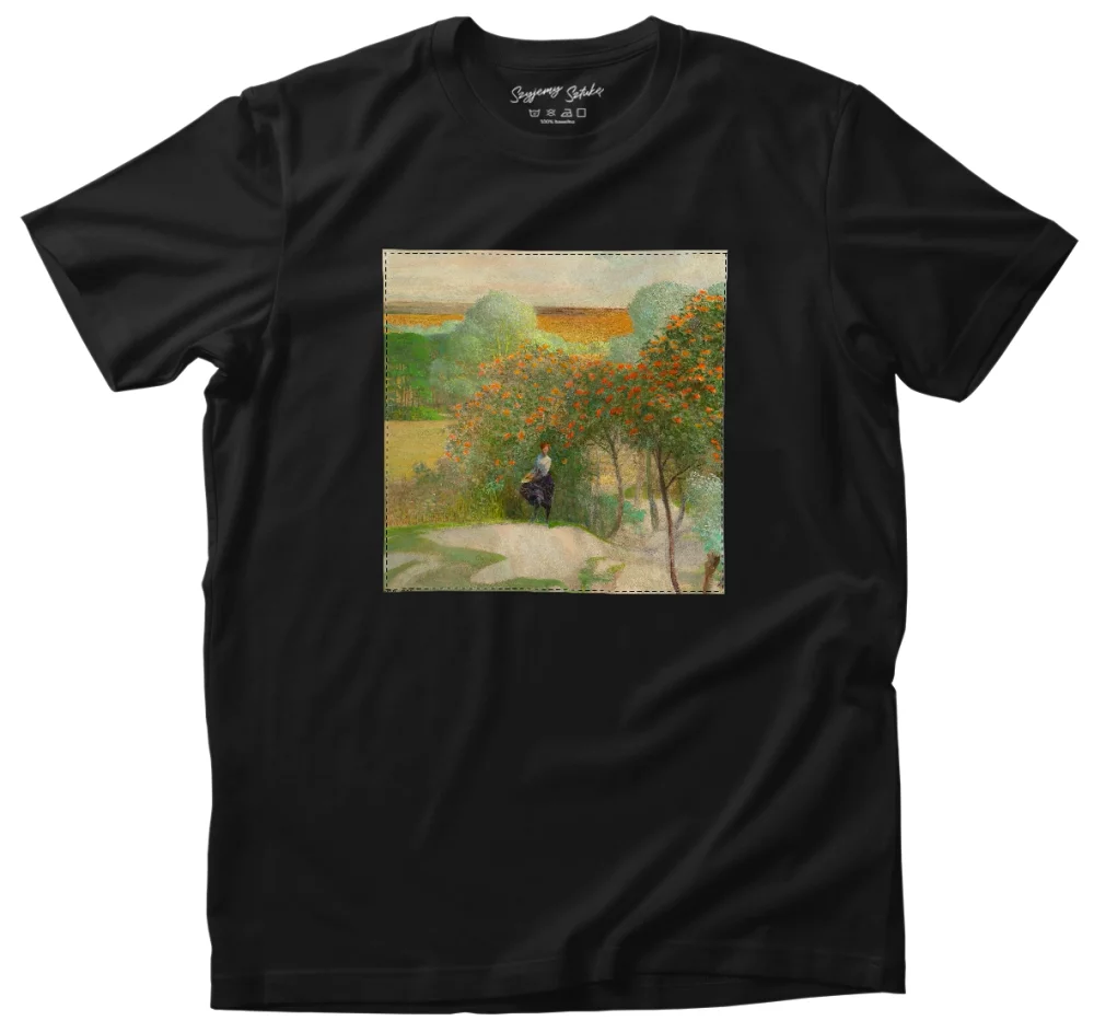 • Koszulka z naszywką Pejzaż z jarzębiną, część prawa tryptyku _Idź nad strumienie_ Jacek Malczewski Wysoka gramatura, trwałość i unikalny detal nadający charakteru. Każda sztuka szyta na zamówienie – wyjątkowa, solidna i stylowa!