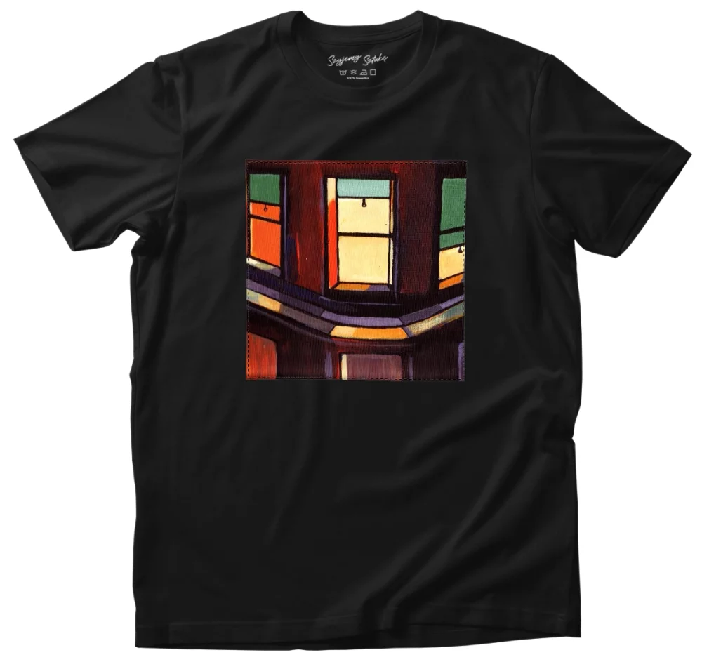 - Koszulka z naszywką Okna nocne Edward Hopper Wysoka gramatura, trwałość i unikalny detal nadający charakteru. Każda sztuka szyta na zamówienie – wyjątkowa, solidna i stylowa!