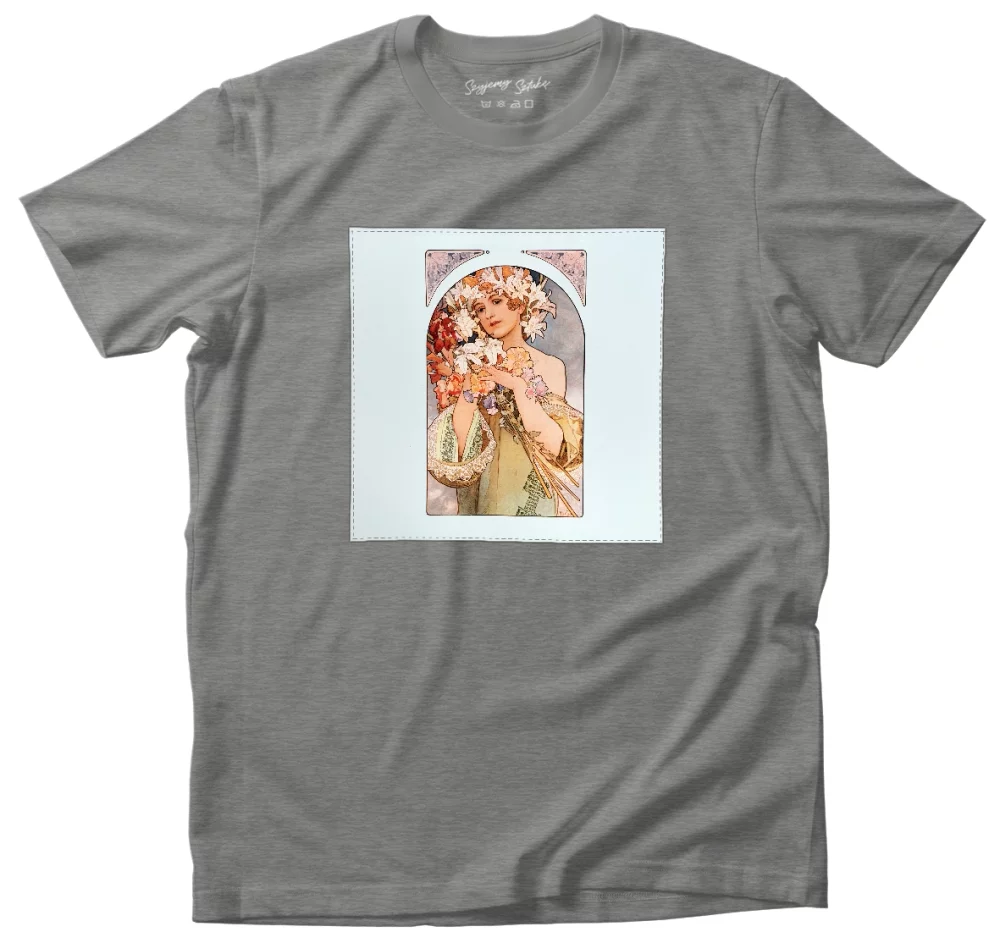 - Koszulka z naszywką Kwiat Alfons Mucha Wysoka gramatura, trwałość i unikalny detal nadający charakteru. Każda sztuka szyta na zamówienie – wyjątkowa, solidna i stylowa!
