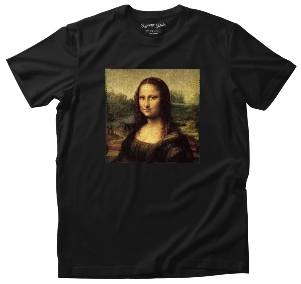- Koszulka z naszywką Mona Lisa Leonardo da Vinci Wysoka gramatura, trwałość i unikalny detal nadający charakteru. Każda sztuka szyta na zamówienie – wyjątkowa, solidna i stylowa!