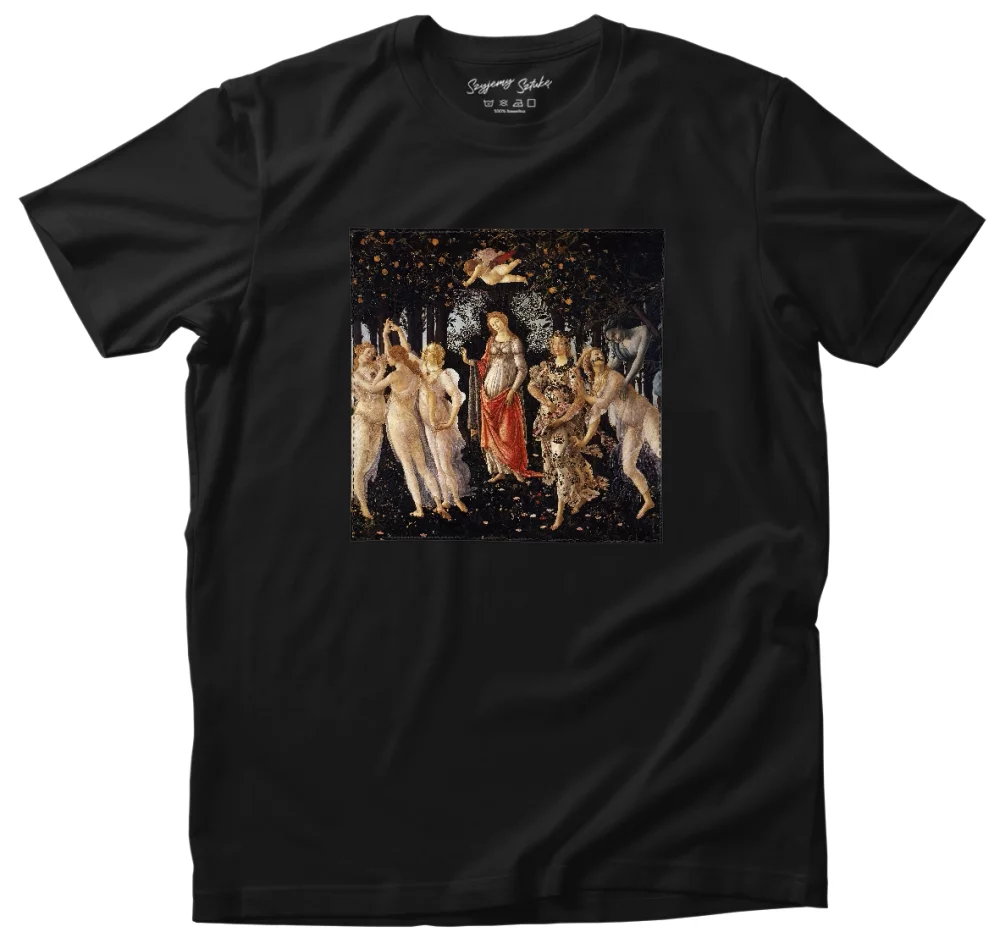 - Koszulka z naszywką La primavera (Wiosna) Sandro Botticelli Wysoka gramatura, trwałość i unikalny detal nadający charakteru. Każda sztuka szyta na zamówienie – wyjątkowa, solidna i stylowa!