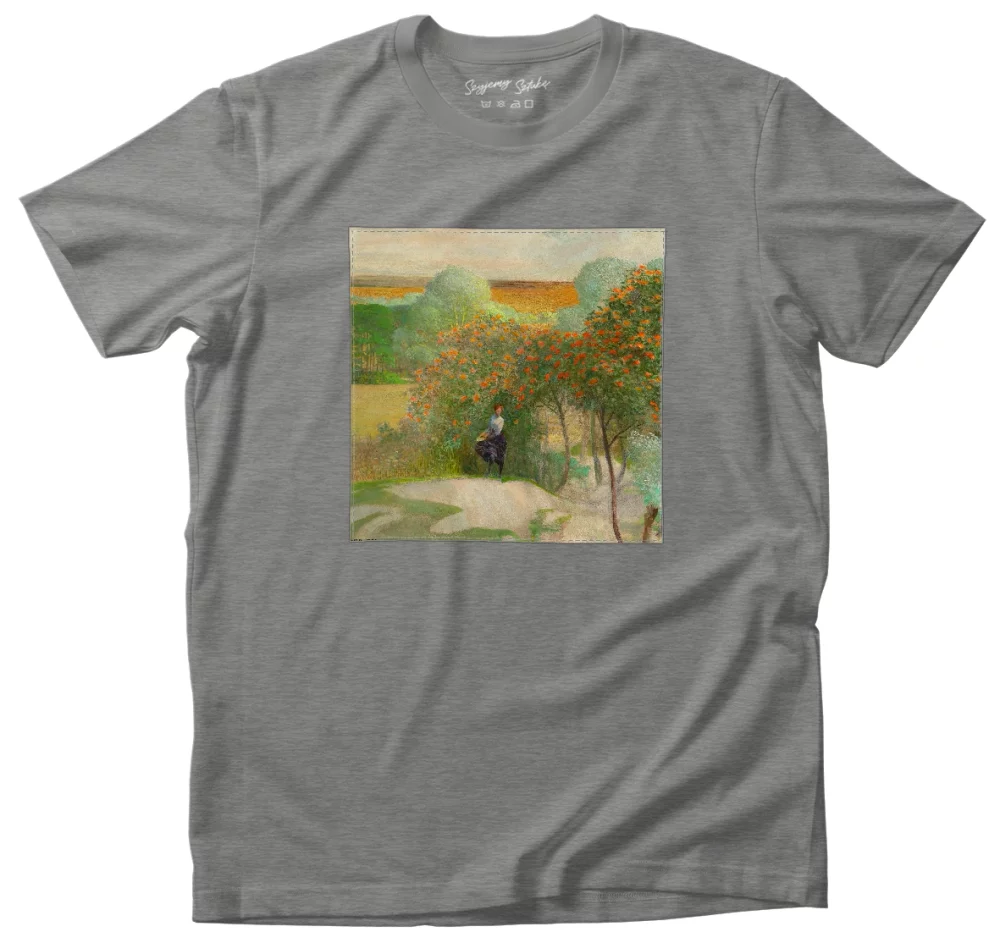 • Koszulka z naszywką Pejzaż z jarzębiną, część prawa tryptyku _Idź nad strumienie_ Jacek Malczewski Wysoka gramatura, trwałość i unikalny detal nadający charakteru. Każda sztuka szyta na zamówienie – wyjątkowa, solidna i stylowa!