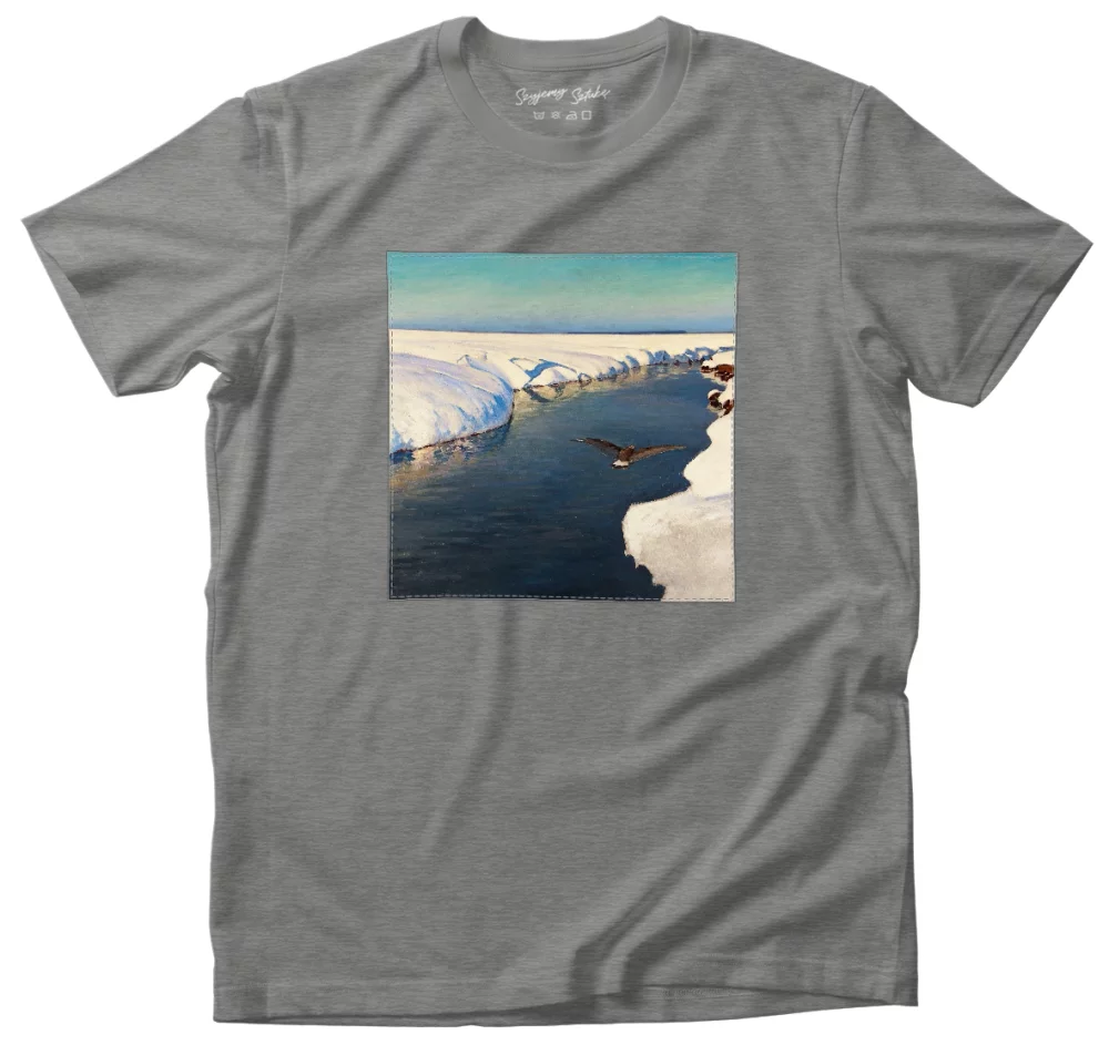 Koszulka z naszywką Pejzaż zimowy z rzeką i ptakiem Julian Fałat