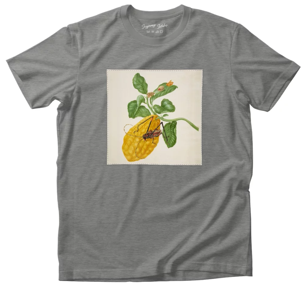 Koszulka z naszywką Cytryna z gąsienicą małpy i chrząszczem harlekin Maria Sibylla Merian 👕✨