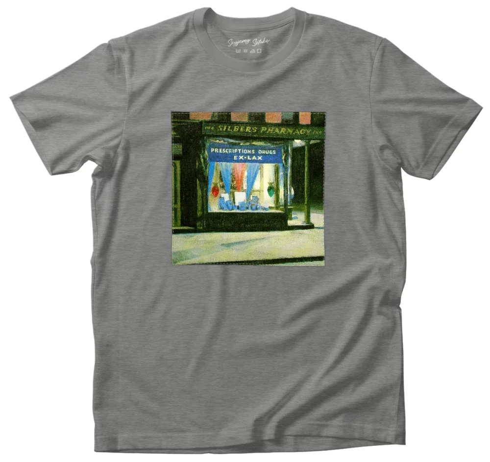 „Apteka” (Drug Store) ukazuje fasadę sklepu w typowym dla Hoppera stylu. Proste, geometryczne formy budynków i kontrast światła i cienia tworzą charakterystyczny nastrój samotności i wyobcowania w amerykańskim pejzażu miejskim.