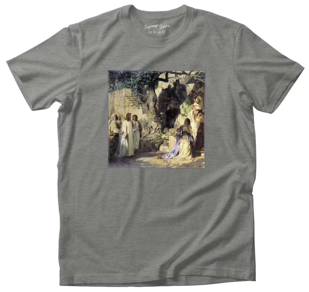 • Koszulka z naszywką Chrystus i jawnogrzesznica Henryk Siemiradzki Wysoka gramatura, trwałość i unikalny detal nadający charakteru. Każda sztuka szyta na zamówienie – wyjątkowa, solidna i stylowa!