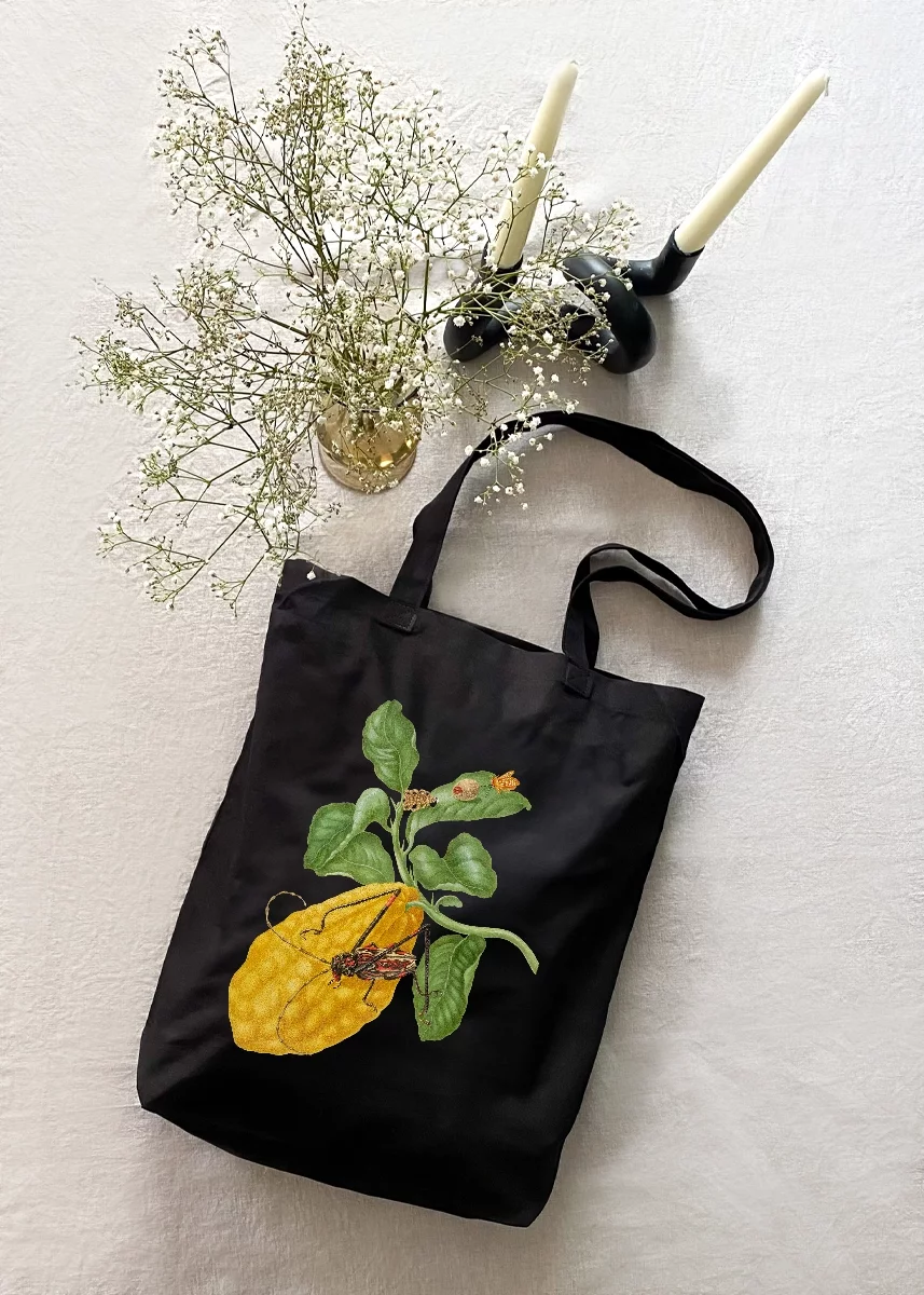 Torba bawełniana Cytryna z gąsienicą małpy i chrząszczem harlekin Maria Sibylla Merian