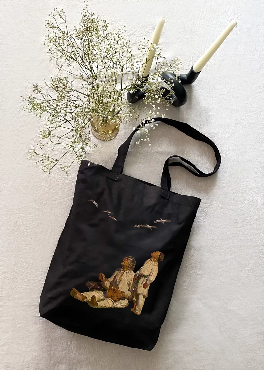 Torby dostępne są w dwóch klasycznych odcieniach: czarnym oraz naturalnym ecru. Oba doskonale podkreślają artystyczny nadruk i pasują do wielu stylizacji – od codziennej po bardziej elegancką.