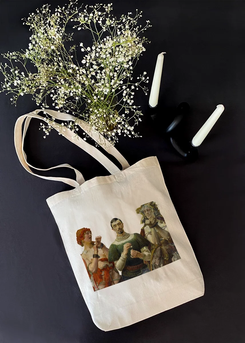 Torby dostępne są w dwóch klasycznych odcieniach: czarnym oraz naturalnym ecru. Oba doskonale podkreślają artystyczny nadruk i pasują do wielu stylizacji – od codziennej po bardziej elegancką.