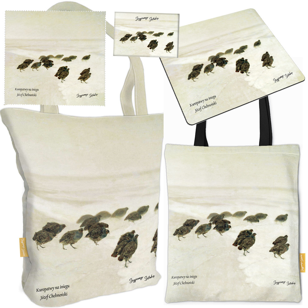 Zestaw prezentowy Szyjemy Sztukę shopper + torba + podkładka + magnes + ściereczka Kuropatwy na śniegu