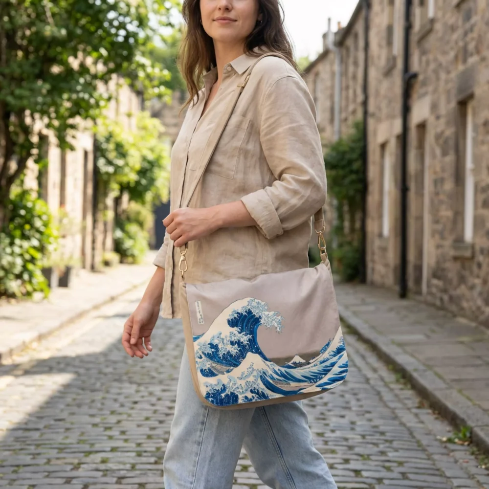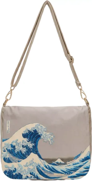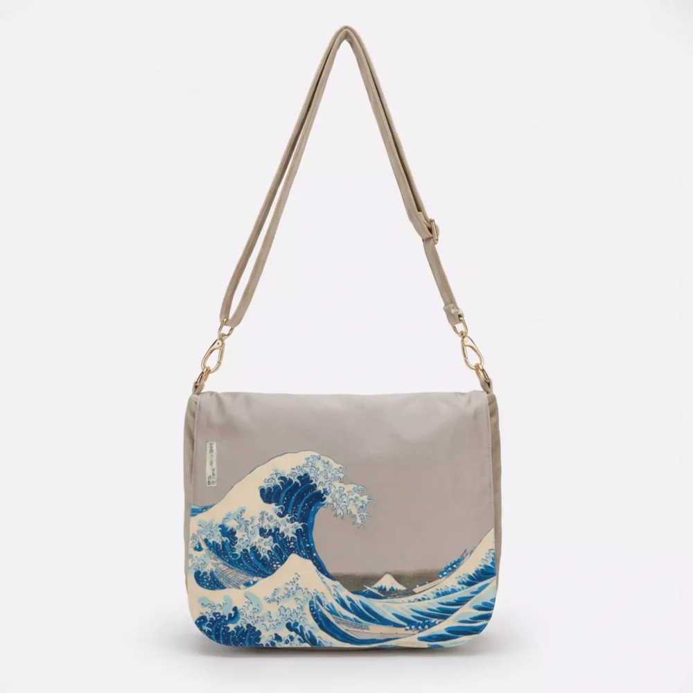 Front torebki zdobi reprodukcja jednego z najbardziej rozpoznawalnych dzieł w historii sztuki japońskiej – „Wielka Fala w Kanagawie” autorstwa Katsushiki Hokusaia. Dynamiczna kompozycja, kontrast fal i górskiego pejzażu oraz charakterystyczna estetyka drzeworytu ukiyo-e nadają torebce wyrazisty, ponadczasowy charakter. Wysokiej jakości nadruk pozwala wiernie oddać detale dzieła i połączyć energię japońskiej sztuki z elegancką formą torebki.