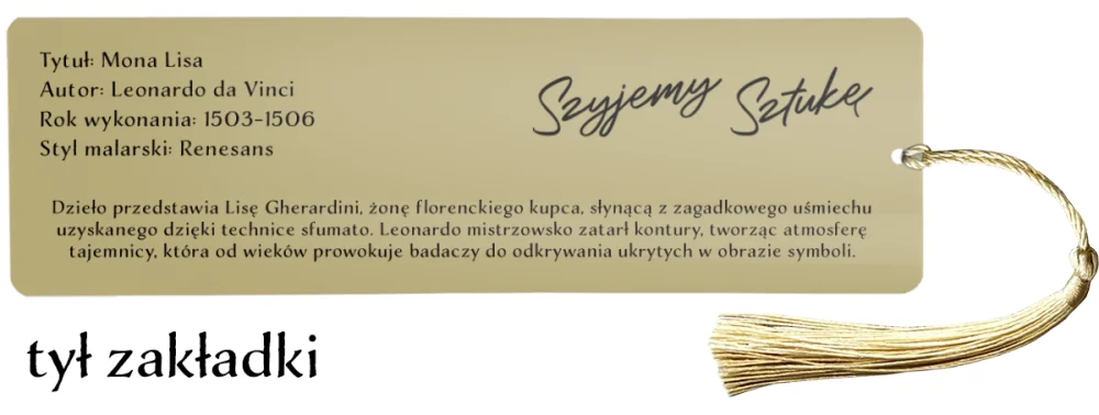 Z jednej strony znajduje się reprodukcja obrazu, uchwycona w kadrze pasującym do formatu zakładki. Druga strona zawiera informacje o dziele tytuł, autora, rok powstania, styl malarski oraz krótki opis. Dzięki temu zakładka pełni nie tylko funkcję praktyczną, ale również edukacyjną.