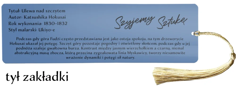 Z jednej strony znajduje się reprodukcja obrazu, uchwycona w kadrze pasującym do formatu zakładki. Druga strona zawiera informacje o dziele tytuł, autora, rok powstania, styl malarski oraz krótki opis. Dzięki temu zakładka pełni nie tylko funkcję praktyczną, ale również edukacyjną.