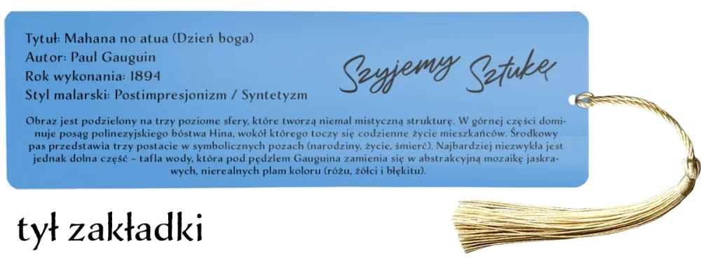 Z jednej strony znajduje się reprodukcja obrazu, uchwycona w kadrze pasującym do formatu zakładki. Druga strona zawiera informacje o dziele tytuł, autora, rok powstania, styl malarski oraz krótki opis. Dzięki temu zakładka pełni nie tylko funkcję praktyczną, ale również edukacyjną.