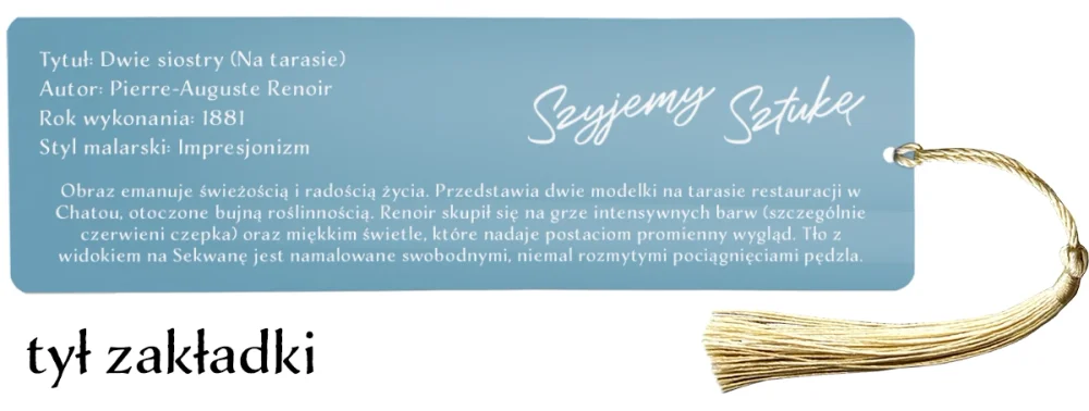 Z jednej strony znajduje się reprodukcja obrazu, uchwycona w kadrze pasującym do formatu zakładki. Druga strona zawiera informacje o dziele tytuł, autora, rok powstania, styl malarski oraz krótki opis. Dzięki temu zakładka pełni nie tylko funkcję praktyczną, ale również edukacyjną.