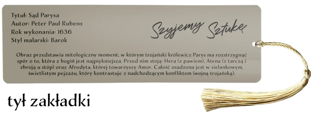 Z jednej strony znajduje się reprodukcja obrazu, uchwycona w kadrze pasującym do formatu zakładki. Druga strona zawiera informacje o dziele tytuł, autora, rok powstania, styl malarski oraz krótki opis. Dzięki temu zakładka pełni nie tylko funkcję praktyczną, ale również edukacyjną.