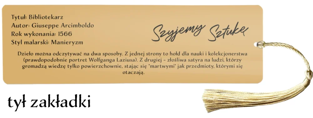 Z jednej strony znajduje się reprodukcja obrazu, uchwycona w kadrze pasującym do formatu zakładki. Druga strona zawiera informacje o dziele tytuł, autora, rok powstania, styl malarski oraz krótki opis. Dzięki temu zakładka pełni nie tylko funkcję praktyczną, ale również edukacyjną.
