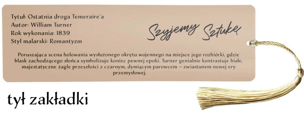 Z jednej strony znajduje się reprodukcja obrazu, uchwycona w kadrze pasującym do formatu zakładki. Druga strona zawiera informacje o dziele tytuł, autora, rok powstania, styl malarski oraz krótki opis. Dzięki temu zakładka pełni nie tylko funkcję praktyczną, ale również edukacyjną.