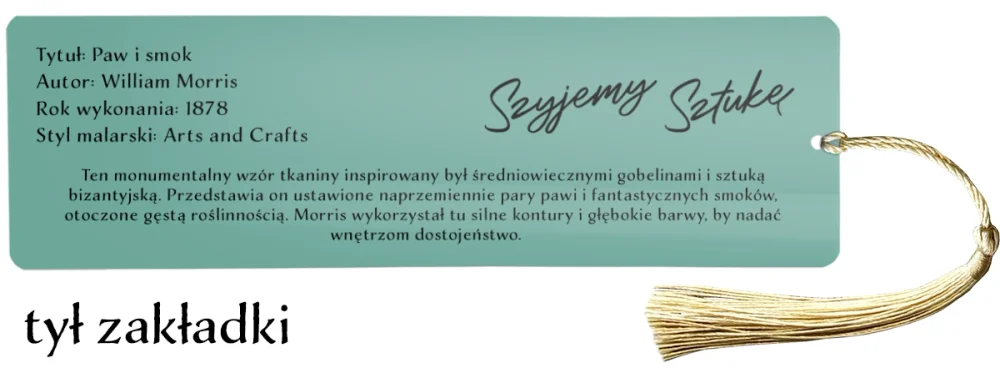Z jednej strony znajduje się reprodukcja obrazu, uchwycona w kadrze pasującym do formatu zakładki. Druga strona zawiera informacje o dziele tytuł, autora, rok powstania, styl malarski oraz krótki opis. Dzięki temu zakładka pełni nie tylko funkcję praktyczną, ale również edukacyjną.