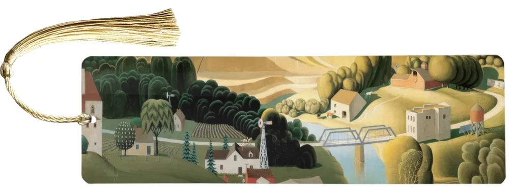 „Stone City” (1930) przedstawia malowniczy krajobraz Iowy, w którym Wood się wychował. Kompozycja cechuje się uproszczonymi formami i miękkimi kształtami wzgórz oraz pól, typowymi dla stylu artysty, dążącego do idealizacji amerykańskiej wsi.
