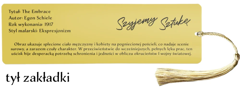 Z jednej strony znajduje się reprodukcja obrazu, uchwycona w kadrze pasującym do formatu zakładki. Druga strona zawiera informacje o dziele tytuł, autora, rok powstania, styl malarski oraz krótki opis. Dzięki temu zakładka pełni nie tylko funkcję praktyczną, ale również edukacyjną.