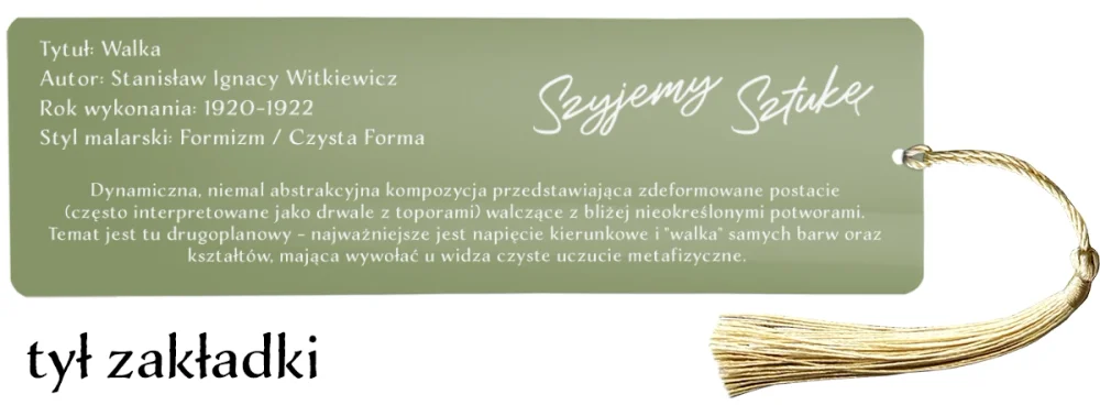 Z jednej strony znajduje się reprodukcja obrazu, uchwycona w kadrze pasującym do formatu zakładki. Druga strona zawiera informacje o dziele tytuł, autora, rok powstania, styl malarski oraz krótki opis. Dzięki temu zakładka pełni nie tylko funkcję praktyczną, ale również edukacyjną.