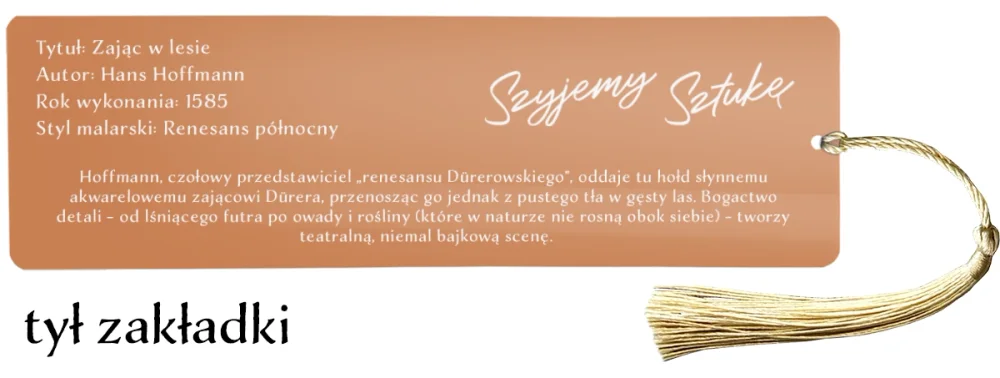 Z jednej strony znajduje się reprodukcja obrazu, uchwycona w kadrze pasującym do formatu zakładki. Druga strona zawiera informacje o dziele tytuł, autora, rok powstania, styl malarski oraz krótki opis. Dzięki temu zakładka pełni nie tylko funkcję praktyczną, ale również edukacyjną.