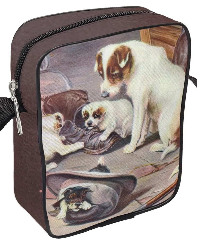 W tej uroczej scenie Trood z humorem portretuje psią rodzinę, która pod czujnym okiem matki urządziła sobie plac zabaw z porzuconych przedmiotów. Podczas gdy jeden maluch z zapałem gryzie stary but, drugi chowa się w kapeluszu, co tworzy pełen wdzięku obraz szczenięcej ciekawości. Artysta po mistrzowsku wykorzystuje ciepłe światło kominka, by podkreślić teksturę sierści i domowy, rustykalny klimat tego spotkania. Całość zachwyca naturalnością i prostotą, oddając radosny chaos, jaki do każdego wnętrza wnoszą młode zwierzęta.