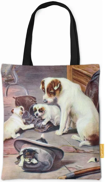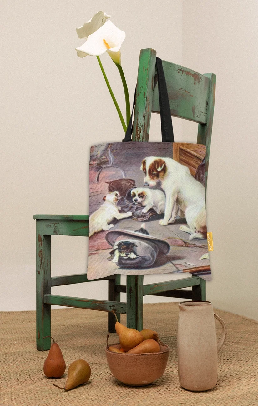 W tej uroczej scenie Trood z humorem portretuje psią rodzinę, która pod czujnym okiem matki urządziła sobie plac zabaw z porzuconych przedmiotów. Podczas gdy jeden maluch z zapałem gryzie stary but, drugi chowa się w kapeluszu, co tworzy pełen wdzięku obraz szczenięcej ciekawości. Artysta po mistrzowsku wykorzystuje ciepłe światło kominka, by podkreślić teksturę sierści i domowy, rustykalny klimat tego spotkania. Całość zachwyca naturalnością i prostotą, oddając radosny chaos, jaki do każdego wnętrza wnoszą młode zwierzęta.