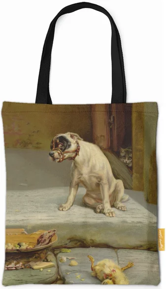 Ten obraz Trooda to przejmująca scena lekcji posłuszeństwa, w której młody pies w kagańcu z widocznym żalem spogląda na upolowaną kaczkę. Skulona sylwetka czworonoga i jego wymowny wzrok doskonale oddają poczucie winy po surowym skarceniu przez właściciela. Całej sytuacji z mroku dyskretnie przygląda się kot, co potęguje atmosferę napięcia i zwierzęcego dramatu. To mistrzowskie studium instynktu, w którym artysta bez zbędnych słów opowiada o trudach wychowania i dyscyplinie.