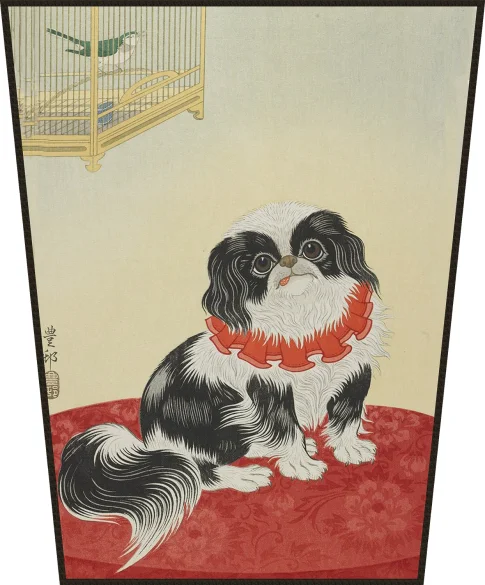 Obraz „Pies pekińczyk” – reprodukcja dzieła malarskiego którego autorem jest Ohara Koson