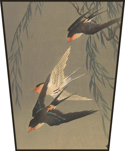 Obraz Trzy jaskółki rdzawoczerwone podczas nurkowania autorstwa Ohara Koson to dynamiczna i pełna lekkości scena, w której ruch nabiera poetyckiej formy. Jaskółki zdają się przecinać powietrze niemal równocześnie, ich smukłe sylwetki i ogniste odcienie kontrastują z spokojnym, stonowanym tłem, tworząc wrażenie chwilowej, ulotnej energii. Koson potrafi uchwycić moment zawieszenia między lotem a nurkowaniem, gdy świat staje się jednocześnie szybki i cichy. To obraz o precyzji natury, w której każdy gest ptaka jest znaczący, a obserwator czuje jednocześnie podziw dla zręczności stworzeń i spokój wynikający z harmonii całej sceny.