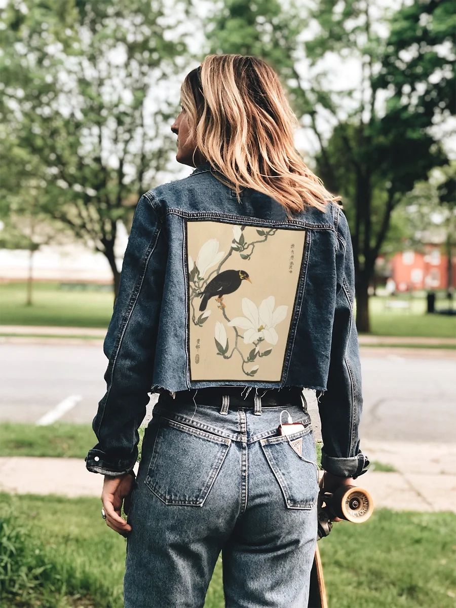 Ekran na plecy – duża naszywka z obrazem Wzgórze Myna na gałęzi magnolii – Ohara Koson