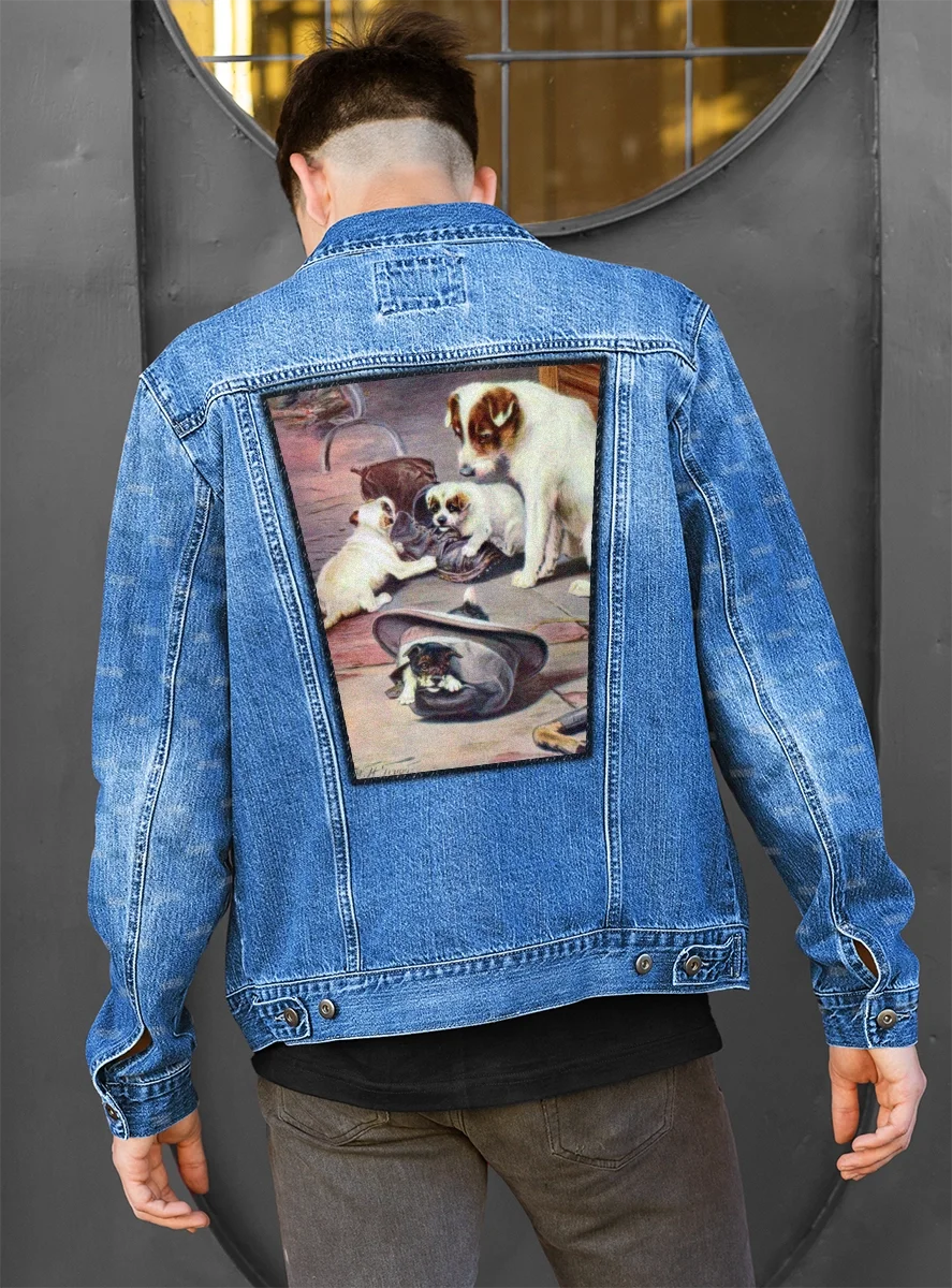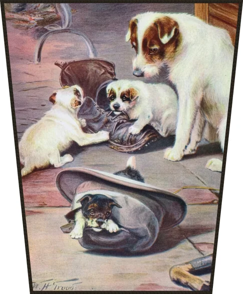 W tej uroczej scenie Trood z humorem portretuje psią rodzinę, która pod czujnym okiem matki urządziła sobie plac zabaw z porzuconych przedmiotów. Podczas gdy jeden maluch z zapałem gryzie stary but, drugi chowa się w kapeluszu, co tworzy pełen wdzięku obraz szczenięcej ciekawości. Artysta po mistrzowsku wykorzystuje ciepłe światło kominka, by podkreślić teksturę sierści i domowy, rustykalny klimat tego spotkania. Całość zachwyca naturalnością i prostotą, oddając radosny chaos, jaki do każdego wnętrza wnoszą młode zwierzęta.