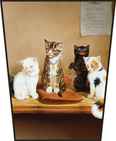 Ten panoramiczny obraz to przegląd kocich charakterów, od dostojnego lidera w obroży po rozbrykane maluchy. Trood z wielką precyzją oddał różnorodność umaszczeń i temperamentów, tworząc ciepłą scenę pełną domowego spokoju i dziecięcej energii. Każdy detal, od śpiących w koszyku po turlające się na plecach czworonogi, składa się na ujmujący portret kociej wspólnoty. To mistrzowski zapis codzienności, który zachwyca autentycznością i lekkością ujęcia tematu.