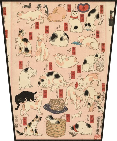 Ten barwny tryptyk Utagawy Kuniyoshiego to pomysłowy zbiór wizualnych rebusów, w których sylwetki kotów nawiązują do nazw stacji słynnego szlaku Tōkaidō. Artysta z wielkim poczuciem humoru przedstawił dziesiątki czworonogów w najróżniejszych pozach – od zabawy i polowania po błogi odpoczynek w koszykach. Każda scenka tętni życiem dzięki precyzyjnej, kaligraficznej linii, łącząc japońską tradycję z niemal komiksową lekkością. To fascynująca podróż przez świat japońskiej wyobraźni, gdzie miłość do zwierząt staje się kluczem do zrozumienia geografii i kultury.
